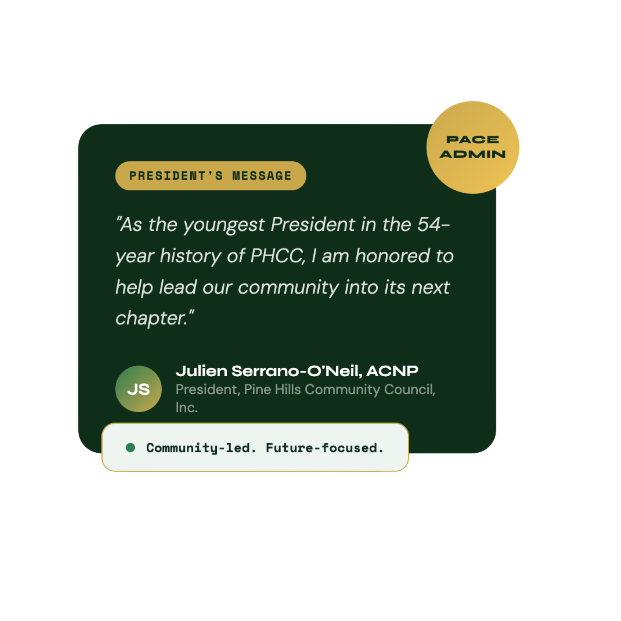 Under The PACE Administration, we are Setting the PACE for a Better Pine Hills by centering Participation, expanding Accessibility, strengthening Collaboration, and leading with Excellence in how we serve our neighbors and partners.